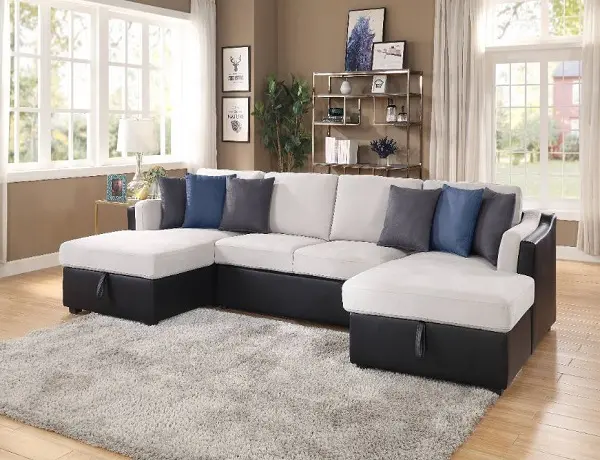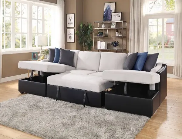 KD, Sectional w/Sleeper () Storage: Chaise, 6 Pillows “U” Shape (NOT Reversible) Includes: LF & RF Chaise both w/Storage, Armless Love w/Pull-out Sleeper (Full Foam) Tight Back & Seat Cushion CONSTRUCTION: S-Spring+Full Foam Seat, Inside Frame: Wood (Eucalyptus & Ply), Foam CUSHION: Box Seat Cushion w/Welt (Tight) BACKREST: Tight Cushion ARMREST: Sloped & Side Pillow Top Plastic Block Leg Metal Sleeper Mechanism Material: Fabric & PU (Solid Pattern) 6 Pillows: Square Shapes, Packed 3 w/Chaise (Contrast Pattern, Removable Cover, Size: 19″ x 19″)