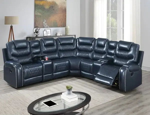 Transitional with a touch of glam, this modular sectional features power motion capabilities to suit each seated person.Wrapped in a light grey top grain leather, this sectional offers plush, tufted backrests with a diamond stamped center pattern.Included is also a console with a lift top storage compartment and two stainless steel cup holders.Adding an extra, refined touch is individual nailhead trim along the rolled arms.This modular sectional also has cool gel memory foam toppers
