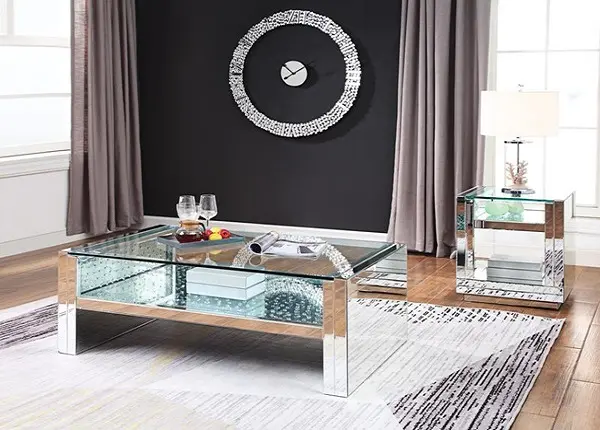 The Nesi coffee table has a modern glam style design finished in mirror featuring faux crystal inlay accents. Tempered Glass Table top and Open bottom shelf for Storage.