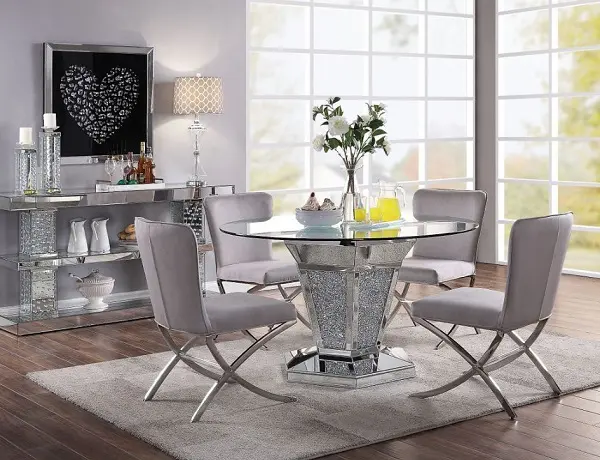 Cultivate a contemporary aesthetic in your entertainment ensemble with this distinctive Noralie dining table. Offering a modern twist on a classic pedestal-style silhouette, this design showcases an angular base with mirror and faux diamond inlay and unique X shape pedestal base. Sleek and stunning, this contemporary table is complemented by the 15-mm tempered clear glass top. Both elements have come together to produce a truly visionary table that will make dinner parties all the more stylish. Enhance your room Decor with this stunning dining room table.