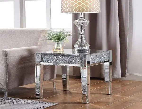 The Noralie End Table will add a contemporary touch to any room in your home. With its clean lines, this brilliant square occasional table showcases a distinctive style for an intriguing look. The table features a fully mirrored beveled frame with tapered legs and a spectacular faux diamond inlay. This beautiful accent table will modernize any space you place it.