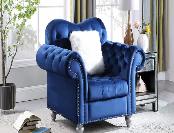 A fresh take on the classic chesterfield style, our Nylah collection is covered in navy Blue velvet for a contemporary feel. The striking set has button tufting adding texture and shape while the rolled arms bring just the right amount of luxury. The large, deep seat cushions feature pocketed springs and velvet wraps for total comfort.