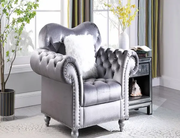 A fresh take on the classic chesterfield style, our Nylah collection is covered in navy Gray velvet for a contemporary feel. The striking set has button tufting adding texture and shape while the rolled arms bring just the right amount of luxury. The large, deep seat cushions feature pocketed springs and velvet wraps for total comfort.