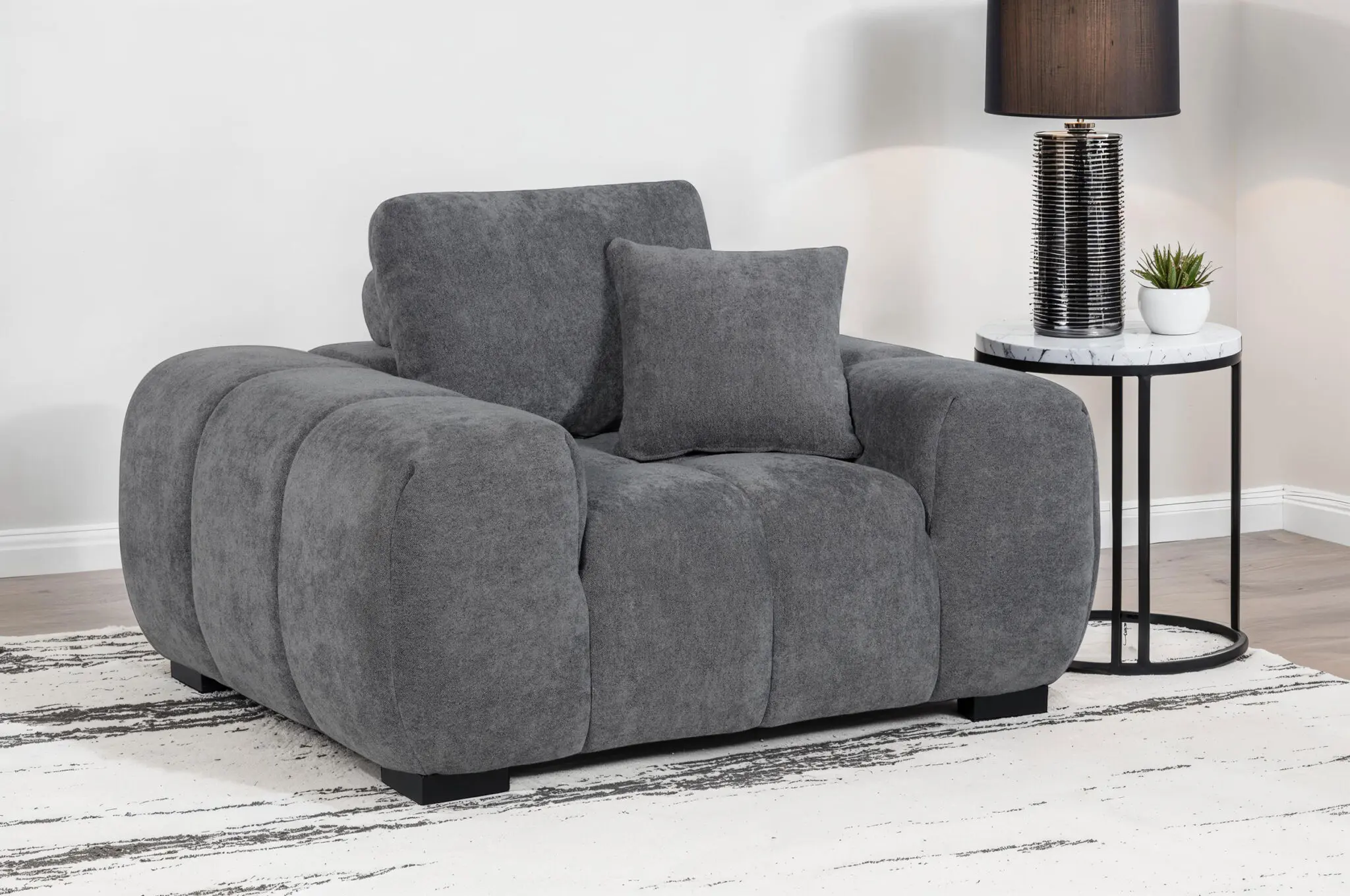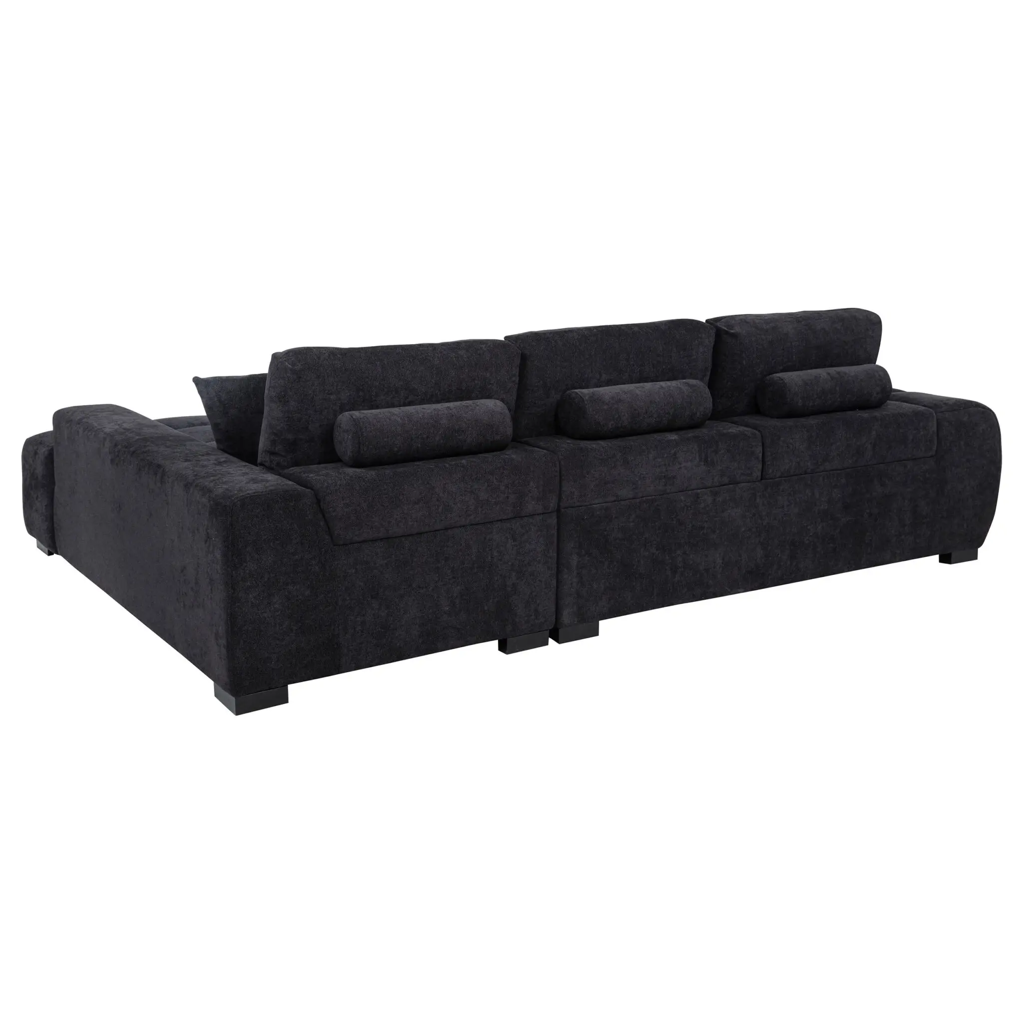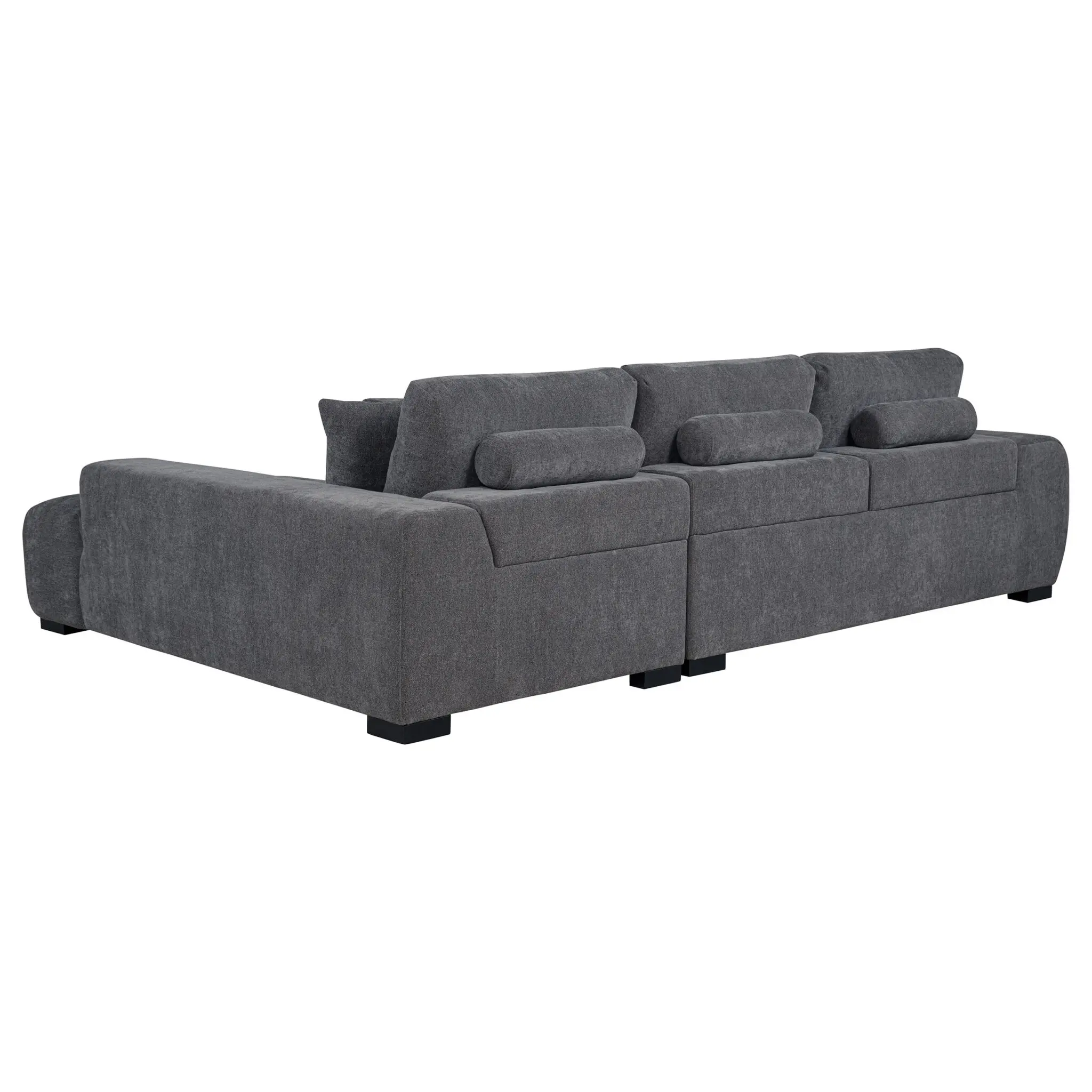 - * Sectional in charcoal grey fabric features a sculpted right-side chaise for extended lounging