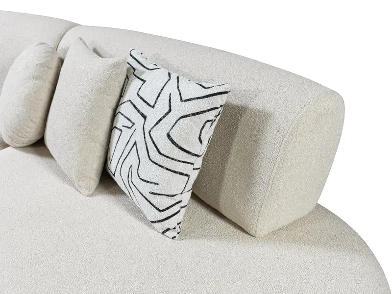 Introducing our Olivia Ivory Boucle 2-Piece Curved Sectional, a perfect combination of style and comfort. Crafted with the utmost attention to detail, this sectional features luxurious boucle upholstery, known for its softness and texture. The Ivory color for this set is carefully selected to provide minimal yet post-modern look. Included with this extraordinary set are three square pillows and two round pillows, meticulously designed to complement the sectional’s aesthetic and provide additional support. Crafted to perfection, this sectional comes in three seamlessly integrated pieces, including an armless loveseat, a right arm sofa, and a left arm sofa, combining versatility with sophistication.