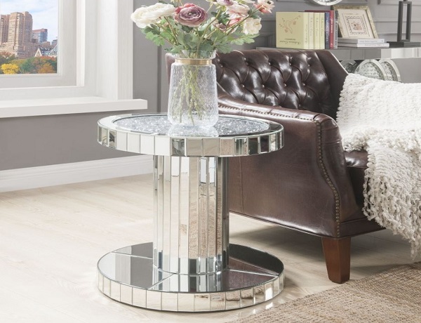 Assambled, Round End Table NO Storage CONSTRUCTION Glass Top: 4mm Clear Tempered Glass with Faux Stone Inlay (Fixed Top) Mirrored Apron & Round Pedestal Base: Mirror, MDF