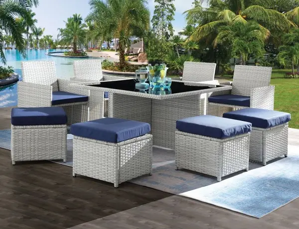 Create some lovely flow and dazzling style on your patio or balcony with this beautiful patio set. This unique blue fabric and wicker set features a cocktail table with glass top, 4 chairs and four backless cubes with fabric cushions. This marvelous and sturdy set is comfortable enough to seat you and your guests as you enjoy some conversation in the great outdoors