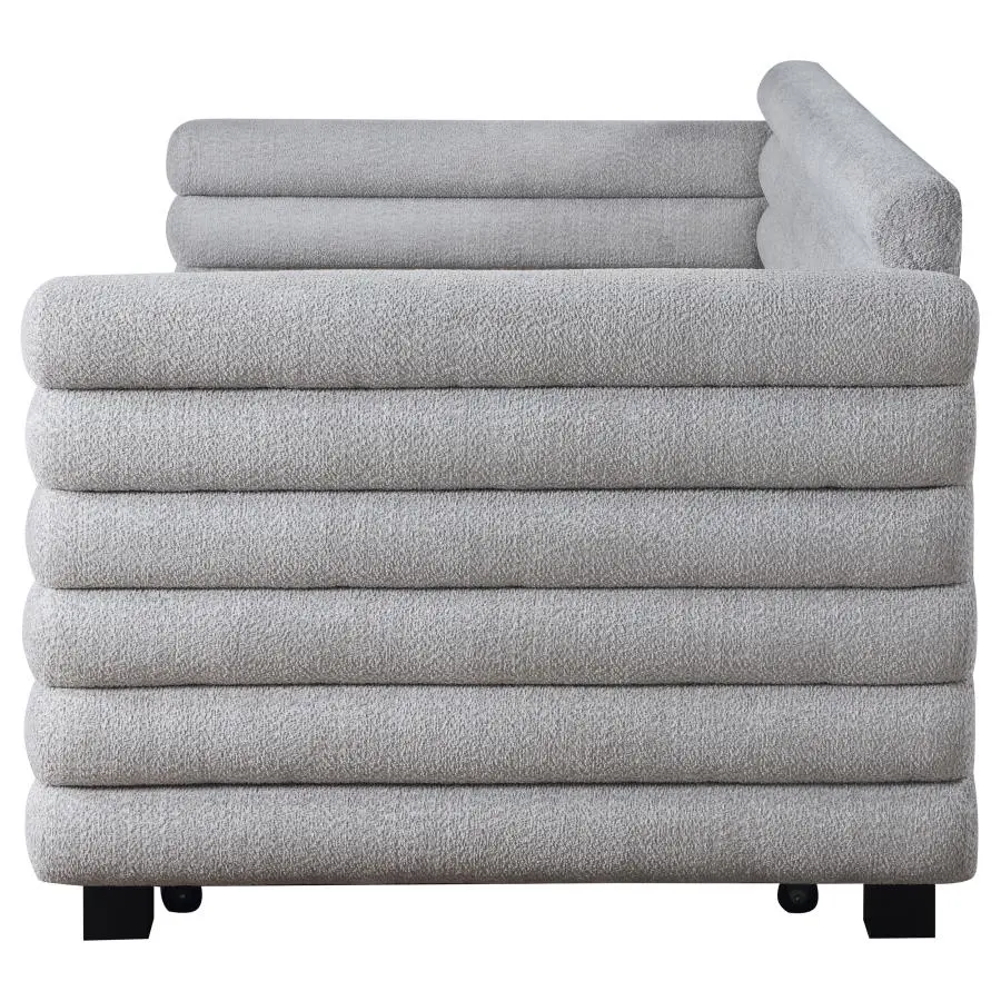 You’re going to love the intriguing silhouette and boucle upholstery featured on this modern daybed and trundle. Offering contemporary flair, the daybed is designed with layered round bolsters, creating exceptional texture and dimensionality in your living room or den. Boucle upholstery is fresh and modern, creating inviting texture and character. The bed and trundle are twin-sized, offering easy lounging on a daily basis, or creating space for a pair of overnight guests. This stylish daybed offers the perfect combination of impressive style and wonderful versatility.