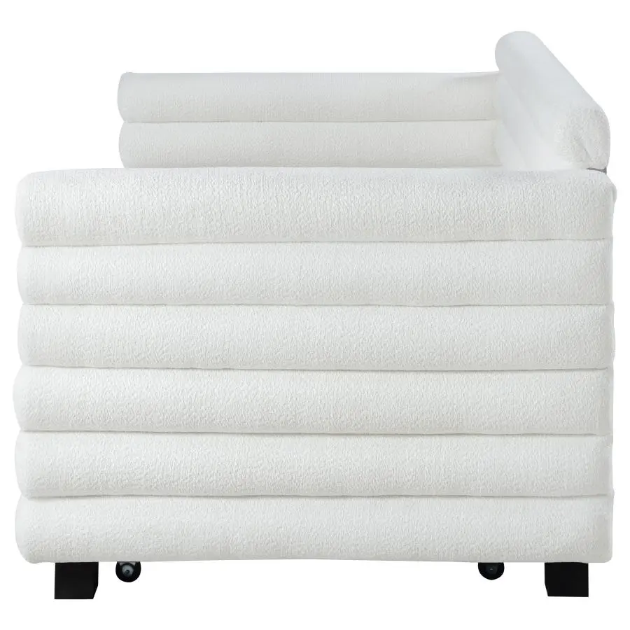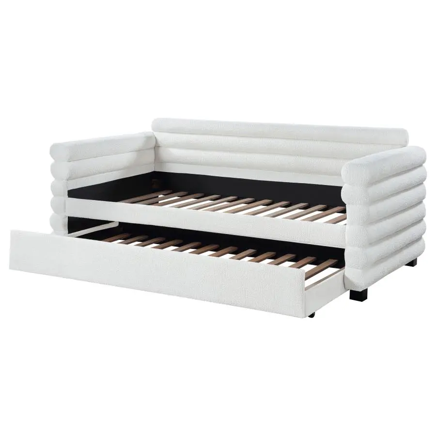 You’re going to love the intriguing silhouette and boucle upholstery featured on this modern daybed and trundle. Offering contemporary flair, the daybed is designed with layered round bolsters, creating exceptional texture and dimensionality in your living room or den. Boucle upholstery is fresh and modern, creating inviting texture and character. The bed and trundle are twin-sized, offering easy lounging on a daily basis, or creating space for a pair of overnight guests. This stylish daybed offers the perfect combination of impressive style and wonderful versatility.