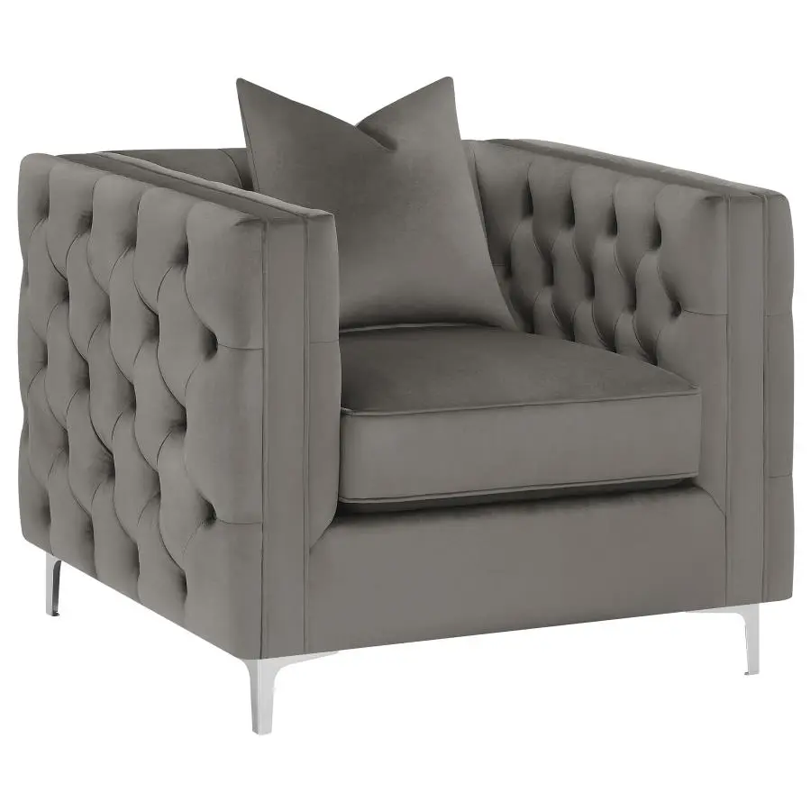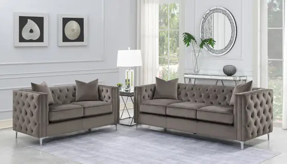 Transform your contemporary living room with this modern glam seating area, complete with a sofa and loveseat. Designed with Tuxedo-like frames, this modern glam sofa and loveseat are upholstered in a soft urban bronze velvet, lending a cozy seat and an earthy neutral color palette. Taught button-tufted backrests and wide track arms offer a flush silhouette that you can really sink into. Below the welted box seat cushions and frame are supportive metal bracket legs in a cool tone metallic finish that create a chic and sophisticated final touch. Matching throw pillows soften the edgy corner interiors.