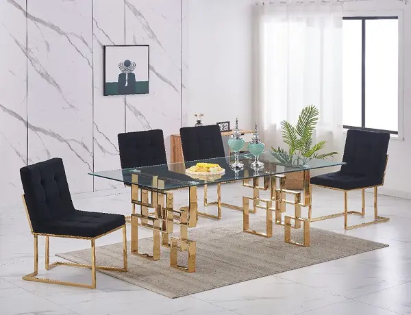 The Pierre Dining Table by Meridian Furniture. Featuring a beautiful contemporary design with gold plated stainless steel base and Genuine glass top. This dining table is guaranteed to be the highlight of any home.