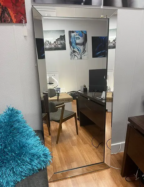 This silver edge floor mirror is sure to be a splendid addition to any room in the home. The six-foot mirror is tall enough to ensure you look flawless from shoes on up. The frame is finished in beveled silver that’s bright and classy. The mirror’s clean, simple lines are stately and regal. Add it to a bedroom or family room for an accent piece that might steal the spotlight.