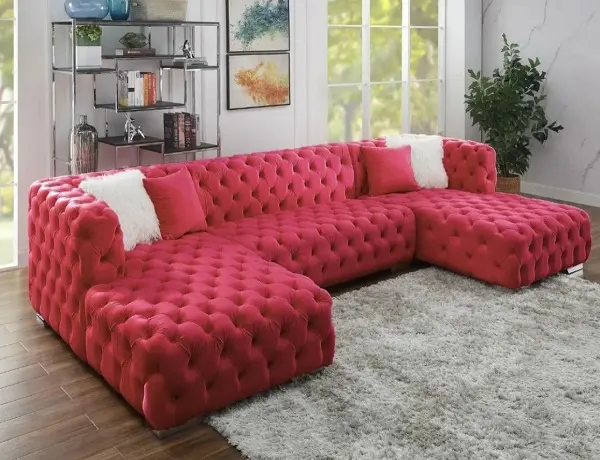 Features a velvet design, deep tufting, double chaise sectional, pillows included.