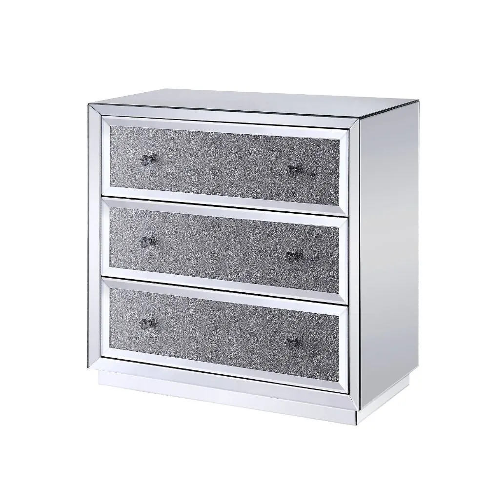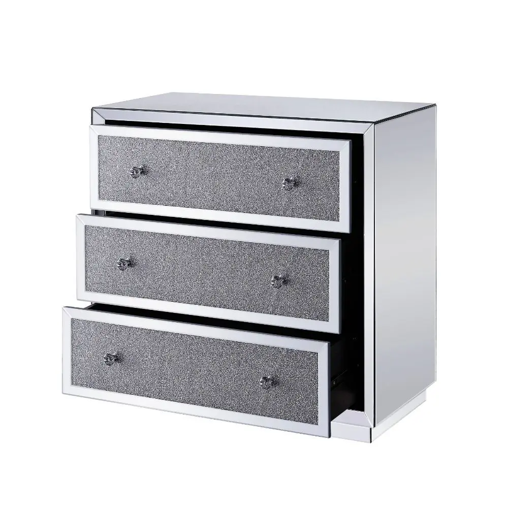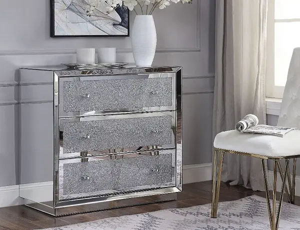 The Rekha Console Table will give any room a touch of glamour. This contemporary console is fully mirrored with a beveled edge and a stunning mirror top and drawer fronts with faux crystal inlay. Use this unique piece as the perfect accent for any room Decor. Three large drawers provide ample and convenient storage for books, remote controls, jewelry, and more.