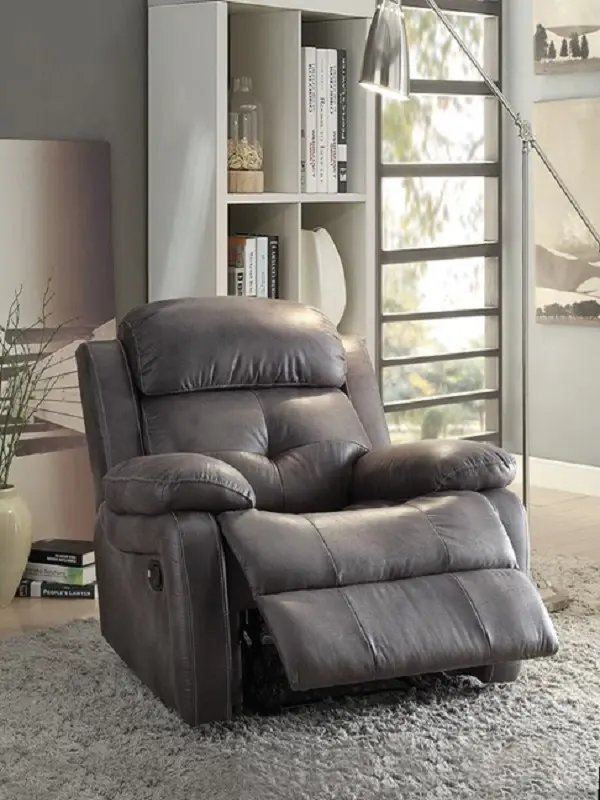 Relax in this inviting recliner in a modern gray finish, the Ashe recliner features placement of the headrest pillow and center tuft button; creating a comfortable recline. Take a load off with the kick up leg support triggered by an easy to use finger-pull. Rest your arms on the overstuffed pillow top armrests during movie time, reading or simply for relaxation.