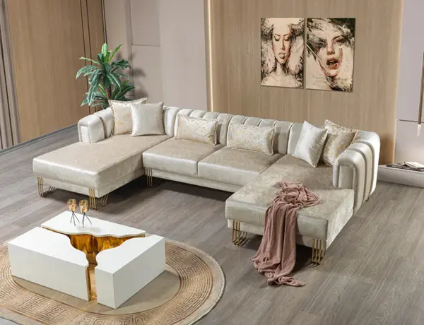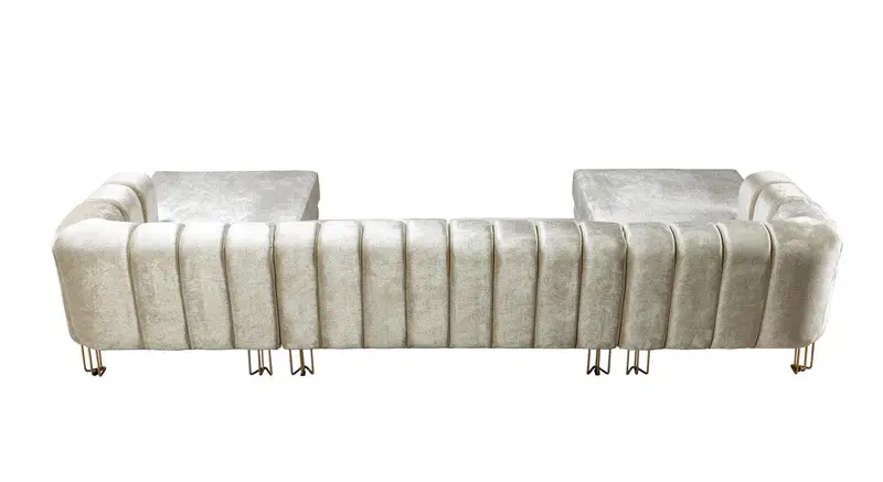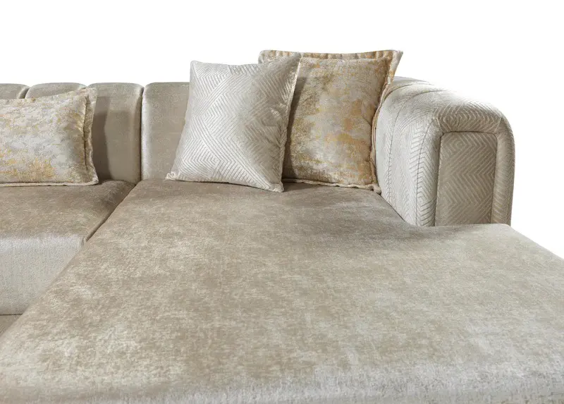 Get ready to relax after a long day with this Santana Ivory Velvet 3pc. Sectional from Nova Furniture. Featuring rich velvet upholstery with deep tufting and comfy pillows, this double chaise sectional provides a luxurious, cozy space to kick back and watch TV, take a nap, or curl up with a nice book. Complete sets of gold and chrome legs complement your contemporary home decor while providing solid support for the sectional’s frame.