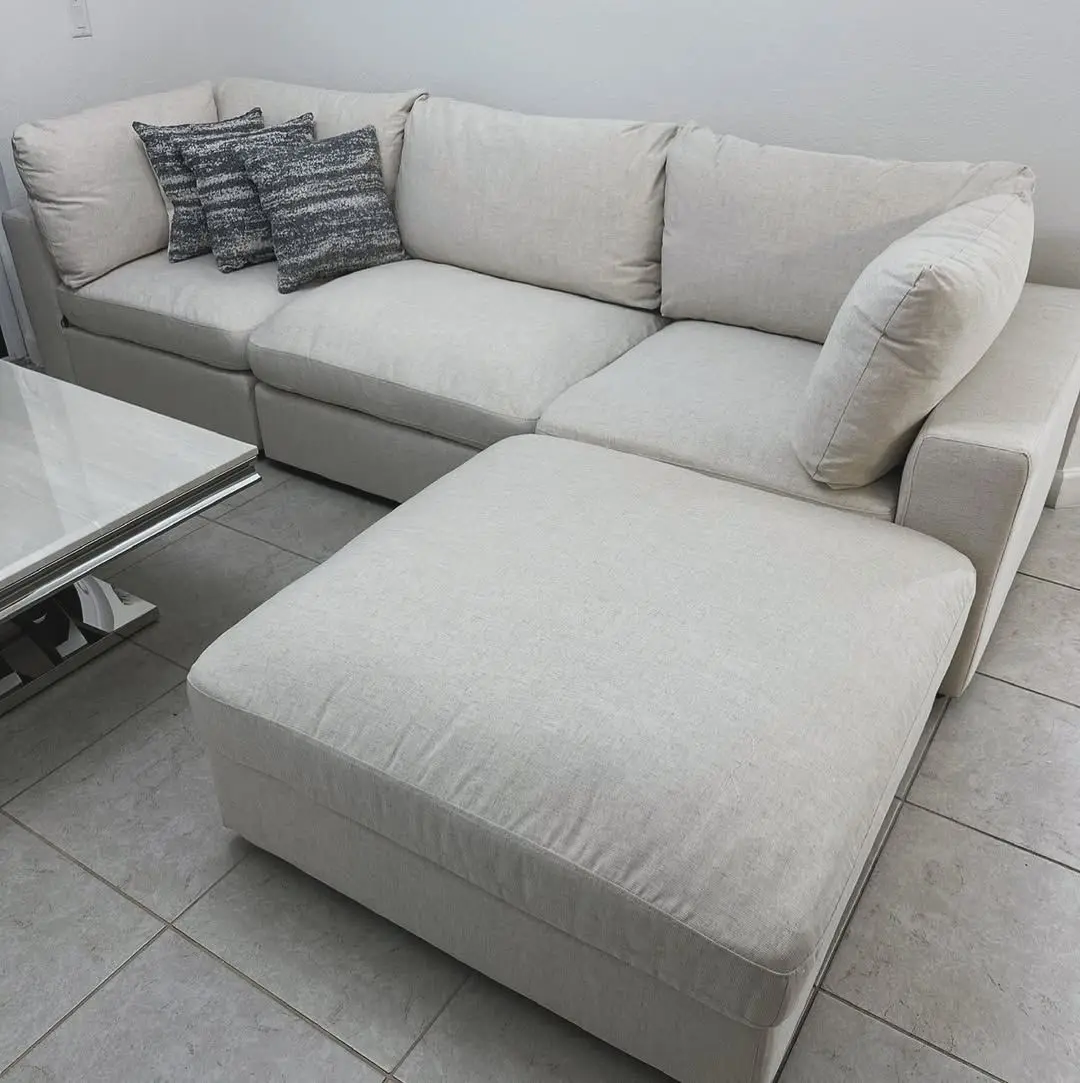 Create a welcoming seating area with this four-piece contemporary sectional. Designed with one armless chair, two corner chairs and one oversized ottoman, this modular sofa lends itself wonderfully to casual, chic entertainment spaces and family living rooms. Wrapped in a breathable linen-like fabric that is soft to the touch, this stylish sectional also features a neutral hue than offers a serene look to a restful retreat. jacquard accent pillows offer extra texture and dimension against the reversible back pillows. Slide the ottoman against a seat to transform the side into a chaise lounge to stretch out or rotate it in front to act as a coffee table for a drink tray.
