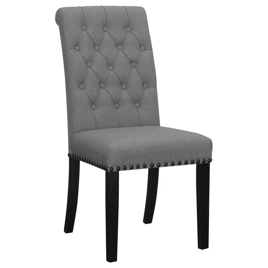 This elegant, contemporary, five-piece dining set completes formal dining experiences with a round, white, cultured marble, and rustic espresso pedestal table and four upholstered parson style side chairs. Charming details like button-tufted rolled backrests, bold nailhead trim, and flared legs lend a classical approach with modern elements.