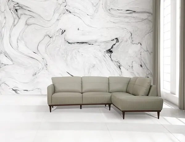 This beautiful pearl gray or airy green leather sofa features contrast stitching and unique wooden trim and tapered legs. Its deep, comfy seat and track style padded arms give it an incredible sink – right- in quality that is perfect for the whole family.