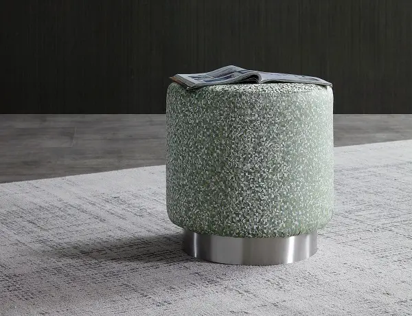 This green colored design round ottoman offers an attractive look for the whole space, very leisure and lively, ideal for the variety of space like negotiations room, conferences, leisure space, living room or lounge, both relaxing for home and office. Soft upholstered in fabric and polished stainless steel base.