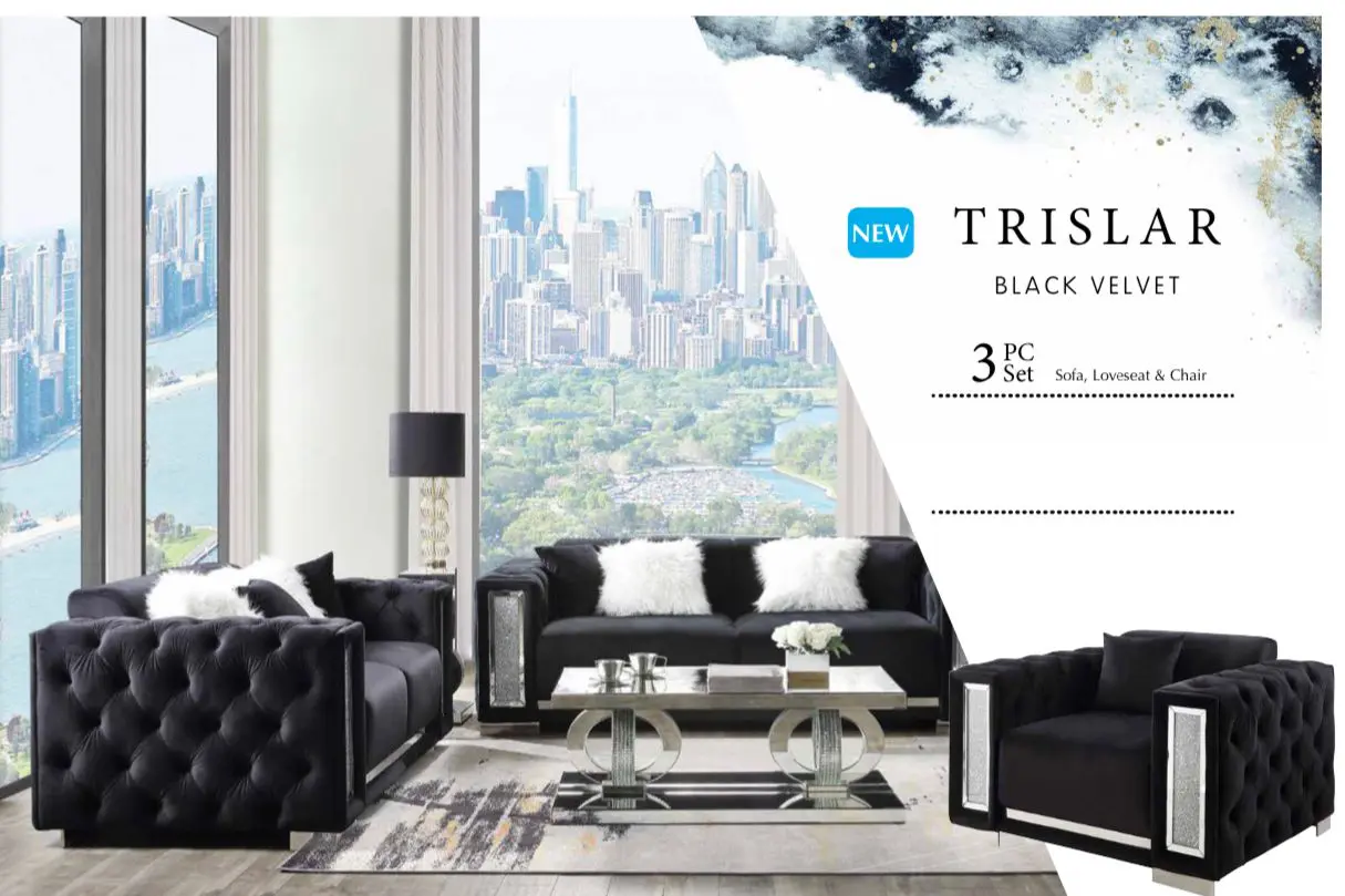 Center your living room around utmost sophistication and exquisite style with this Trislar collection. The collection offers your interior space eye-catching appeal with its button-tufting details and mirrored trim accent. In a buttery soft black velvet upholstery to add richness and perfect modern glam addition for any room. With sleek chrome legs, this piece not only adds refined elegance, but also provides ultimate tranquility.