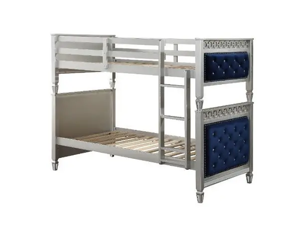Fulfill your children’s dreams of being royalty with this Varian twin over twin bunk bed and trundle. With elegant details such as a silver finish, button-tufted velvet upholstered headboard and footboard panels, and beautifully tapered legs, all add to the regal vibes of this design. Impromptu sleepovers are a breeze with the pull-out trundle. The safety guardrails add ease, knowing that there will be no falls at night. Great for growing kids, this bed offers the function to be converted into two separate twin beds.