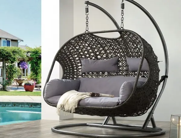 KD, Patio Swing Chair & Stand Seat Cushion Included (Removable) Includes: Swing Chair, Stand, Cushion CONSTRUCTION: Frame Black Finish, Wicker (mm Round) & Steel Powder Coated (mm) SEAT CUSHION: Fabric Material: Fabric (Solid Pattern)