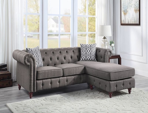 Contemporary style from this blue chaise sectional dresses up any living room. Glamorous and brilliant, shiny button tufting adorns the back cushion and portion of the frame. Fully upholstered, the high back and arms exude chic style. A decorative nail head trim runs along the front and top, creating another layer of glimmering detail. Thin and tapered wood legs complete the radiant look.
