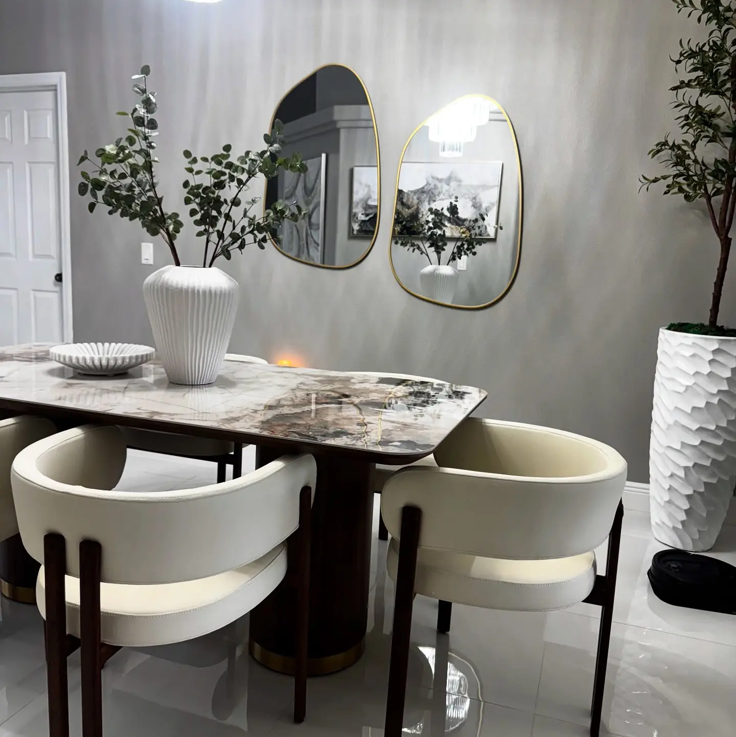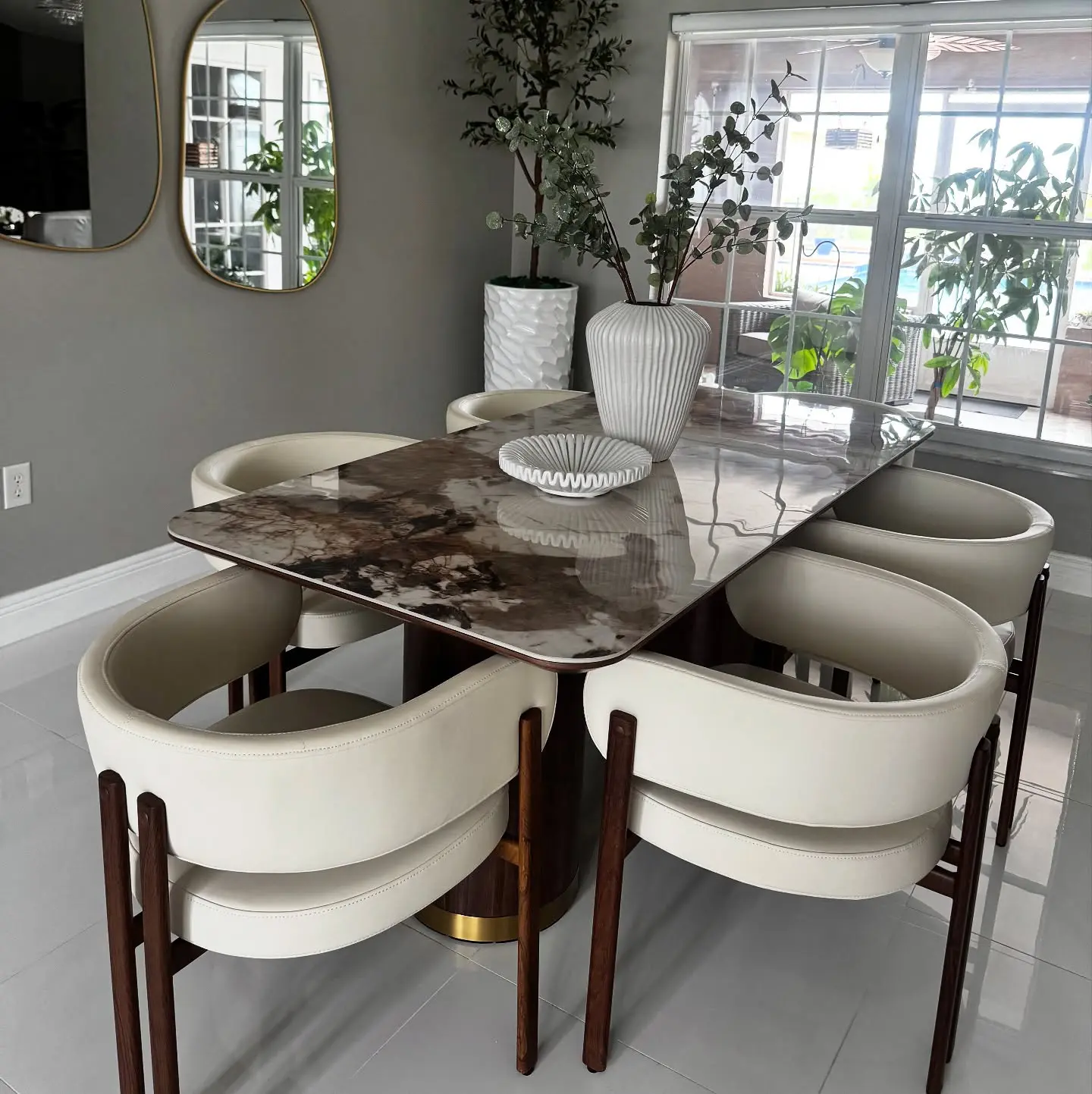 Willene collection exudes elegance with its rectangular dining table featuring a fixed white marble top and double pedestal base with metal trim. Paired with upholstered chairs and a server with metal legs, this set blends sophistication and contemporary style. Perfect for hosting elegant dinners and creating memorable moments, the Clayten collection brings luxury and comfort to your dining space