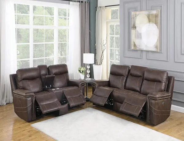 Enjoy the big game or movie night with your favorite person on this power^2 reclining loveseat. This dual reclining loveseat features power controls for both recline position and headrest support, creating custom personal relaxation. The quality performance micro denier gives the look of genuine leather with characteristic nailhead trim upholstery. Keep drinks and snacks handy with the center console, complete with two cup holders. Choose the best color to suit your decor theme.